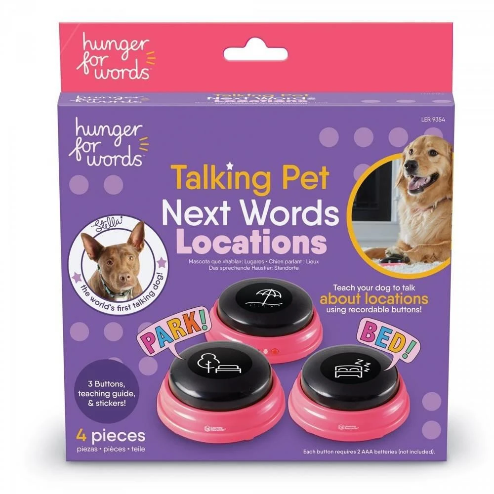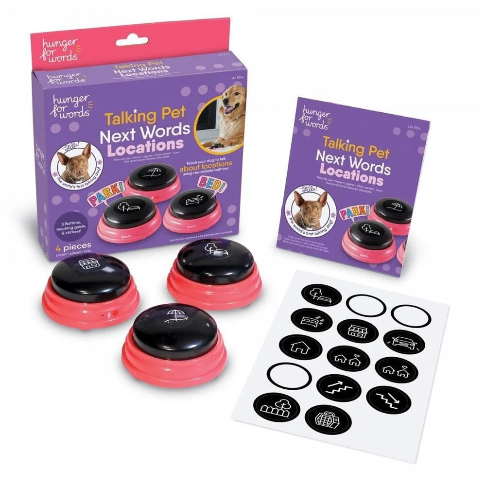 Le kit Talking Pet Next Words Locations est un kit à 3 boutons avec la possibilité d’enregistrer des mots et un guide écrit par Christina Hunger pour vous aider à comprendre le concept et vous guider dans les exercices jusqu’à ce que vous réussissiez complètement. Il s’agit de l’étape suivante de l’apprentissage de votre chien, une fois qu’il a appris les bases du kit de démarrage. L’objectif est que votre chien utilise avec précision des mots liés à des lieux tels que parc, plage, lit, etc.