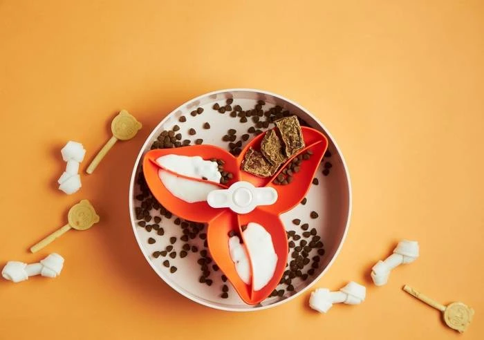 Chaque bol Spin peut être rempli d’une variété d’aliments : des croquettes croustillantes aux légumes frais. Les compartiments de différentes formes et tailles présentent de nombreuses textures que les animaux peuvent explorer.
