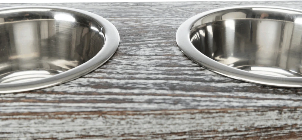 Gamelles pour chiens en acier inoxydable sur un support en bois verni. Cet ensemble de gamelles pour chien a été fabriqué à partir de matériaux de haute qualité. Le set comprend deux gamelles d’une capacité de 0,75 l, leur diamètre et leur profondeur sont adaptés aux chiens de petite race et à tous les chats. Les bols sont logés dans un support robuste en bois véritable verni. Le support empêche les bols de bouger pendant le repas et empêche les animaux indisciplinés de les renverser. La base du support en bois comporte quatre pieds pour éviter de rayer le sol.
